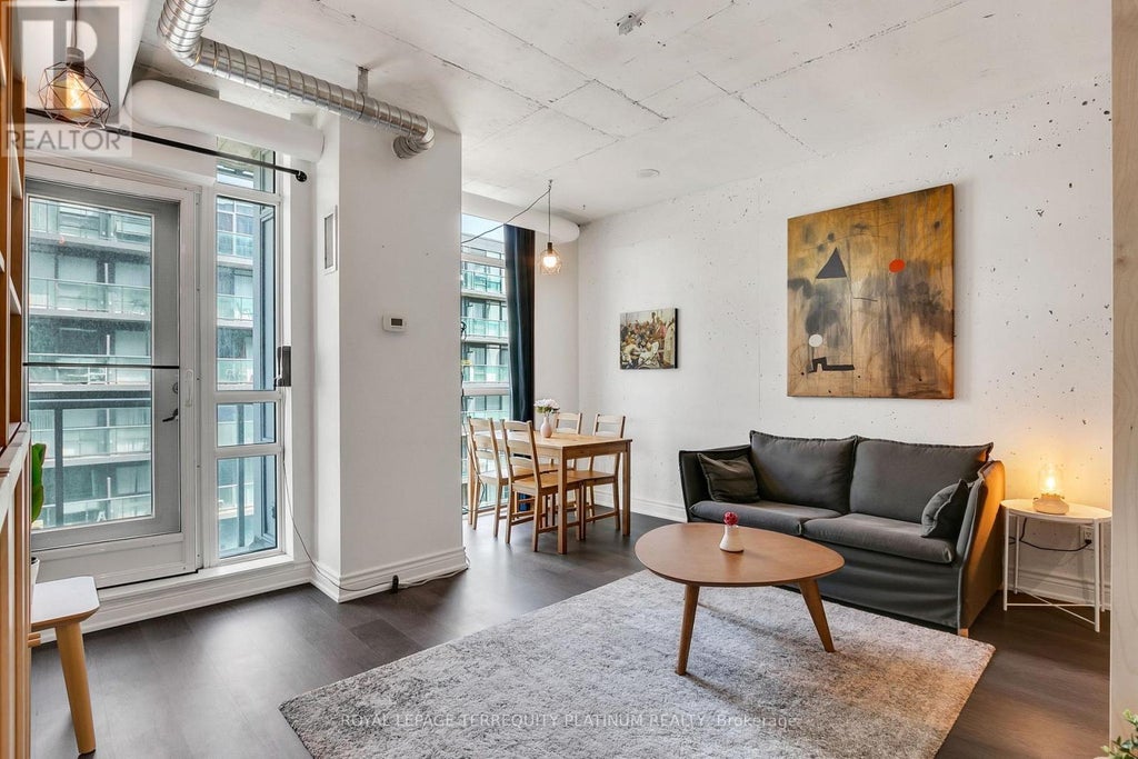 True Loft Living at Westside Gallery Lofts in Prime Queen West! Where Little Portugal meets Liberty Village, this stylish condo puts you in the middle of Toronto's most dynamic west-end neighbourhoods. Just steps to local landmarks like The Drake Hotel, The Gladstone, Trinity Bellwoods Park, plus endless cafes, galleries, boutiques, and nightlife. Transit, the GO Train, and major routes are all close by, making commuting simple. Inside, enjoy soaring 9+ ft exposed concrete ceilings, an open-concept living/dining space with a walkout to your balcony, and a large bedroom retreat. The modern kitchen features stainless steel appliances and granite counters.Building amenities include a fully equipped gym, meeting room, guest suites, and visitor parking. (id:6289)