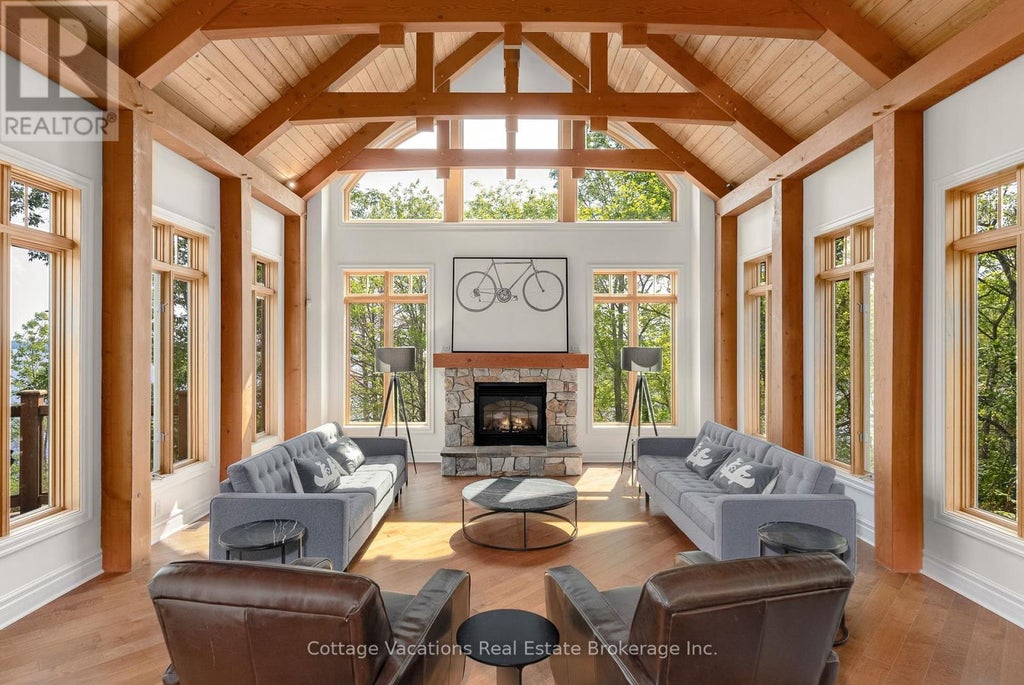 A rare opportunity to own a truly exceptional retreat+investment on the coveted south shore of Lake Muskoka. Welcome to Muskoka Blue, an extraordinary offering that combines modern sophistication with the timeless beauty of Muskoka's natural landscape. A strong history as a very successful rental property with proven revenue allows the next owner to seamlessly start making a return on their investment from day one. Ideally situated less than two hours from the GTA, this stunning cottage delivers both accessibility and a world away feeling for an unrivaled sanctuary for those seeking the finest in waterfront living. Showcasing over 2,700 square feet of thoughtfully designed living space, Muskoka Blue features 5 bedrooms and 3 bathrooms, perfectly appointed for relaxed, elegant entertaining. Soaring 21-foot vaulted ceilings and expansive walls of glass frame breathtaking, long lake vistas, creating seamless indoor-outdoor connections. The great room, anchored by a grand stone fireplace, is both impressive and inviting, while the screened Muskoka room and extensive decking further extend the living spaces into the natural surroundings.The chefs kitchen is the heart of the home, offering a large centre island, Quartz countertops, and premium stainless steel appliances the ideal setting for gathering with family and guests. Outdoors, a private cantilevered dock invites endless exploration across Muskoka's famed Big Three Lakes Muskoka, Rosseau, and Joseph with exceptional opportunities for boating, swimming, and water sports. Designed for memorable entertaining, the generous outdoor granite fire pit area, al fresco dining spaces, and thoughtful landscaping ensure privacy and tranquility. Offered fully furnished, Muskoka Blue is a true turnkey property, offering immediate enjoyment of all Muskoka has to offer. Rental income history available upon request. (id:6289)