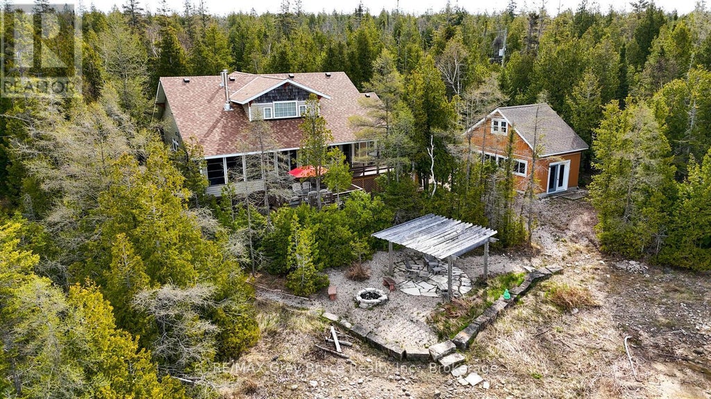 Welcome to your private lakefront home with sandy beach on a beautiful cove ideal for weekend retreats or your retirement years. Drive up the winding driveway through the pine trees and leave your cares behind. The property is nicely situated to provide expansive lake views where you can watch the seagulls circle and enjoy glorious sunsets from one of two decks or the stone beachside patio. The sandy bottom water entry allows for family members of all ages to enjoy swimming, kayaking or paddle boarding. Play all day then enjoy evenings by the fire while listening to the water lap at the shoreline. Along with 2 generous sized decks the home features two covered porch seating areas, at both the front and back, with walkouts from the main floor bedroom, sunroom, dining room & living room. Inside you will discover that each room has been situated to take advantage of the water views, along with little touches throughout that make this property unique. The large generous kitchen/dining and living area with its soaring ceiling provides open plan living and space for entertaining. A two-sided fireplace with custom designed surrounds, provides ambience for relaxing in both the living room or the primary bedroom. There are two bedrooms located at each end of the house for added privacy. The primary bedroom with ensuite, leads to a screened three-season sunroom with a sofabed and woodstove, a restful retreat for a morning coffee or a good book. A second generously sized bedroom along with a four-piece bath round out the main floor. The kids will love the loft bedroom with its four single beds and views of the lake. It is the perfect getaway for sharing nighttime giggles or pulling out a game and making memories. The property also has a single car garage with space above for extra storage or room to finish for a Bunky or games room. This home comes turnkey and is conveniently located across from the Bruce National Park and within a 15-minute drive of Tobermory for amenities. (id:6289)