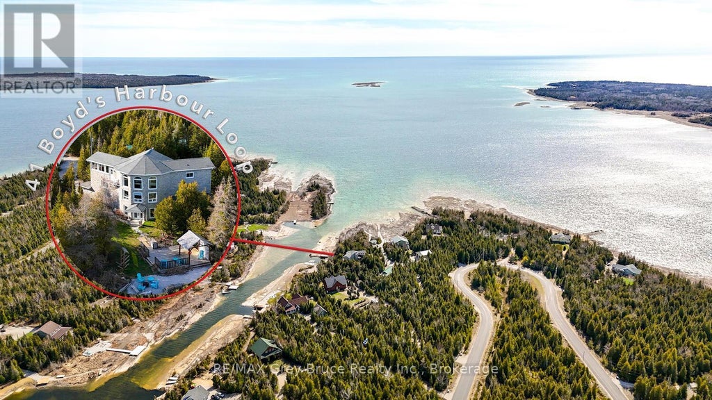Experience the ultimate in turnkey luxury living in this 3-story, 3000+ sq ft waterfront home on beautiful Boyds Harbour. The attention to detail in this home is evident, from the beautiful stone exterior to the large windows that showcase the stunning waterfront and allow light to cascade in. With its spacious layout and amenities, this home offers the perfect retreat for relaxation and enjoyment. The double door entry sets the tone with its large family room, cozy fireplace and bright interior, providing a welcoming atmosphere for gatherings. Indulge and rejuvenate in your own personal sauna and hot tub room and let the cares melt away. Climb the grand staircase to the main floor and step into the stylish and inviting open plan living room, dining room and stunning kitchen. Also, on the main floor you will find two beautiful bedrooms each with a 3-piece bath providing both comfort and privacy for your family and friends. The primary suite occupying the entire upper level offers a large spacious bedroom overlooking the great room below and a luxurious ensuite with marble flooring, double sink vanity, steam shower, and a gorgeous tub perfect for a soothing soak. There is also a sunroom which captures the lake views and offers a place to sit and enjoy a glass of wine. With its waterfront seating area and direct access to Lake Huron via a private dock on a shared boating water well, you can easily take advantage of waterfront activities and breathtaking views. For added parking there is a carport with attached workshop to putter away the hours. The central location on the Peninsula, provides the perfect balance of seclusion and accessibility to amenities with Lion's Head a short 15 minute drive away. Escape the hustle and bustle of everyday life and live out your dreams here on Boyds Harbour Loop. (id:6289)