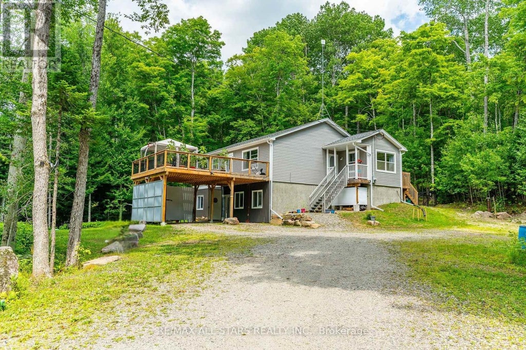 Tucked away on a quiet township road just 10 minutes form Haliburton, this well maintained raised bungalow offers the perfect mix of comfort, privacy, and outdoor adventure. Set on a peaceful 1.8 -acre lot, this 4-bedroom, 2-bathroom home is only 7 years old and move-in ready. The main floor features a bright, open-concept layout with a modern kitchen, stainless steel appliances, and a dedicated dining space framed by large windows that bring in views of the surrounding forest. The spacious living area includes a walkout to a large deck. Ideal for entertaining, relaxing or grilling with friend and family. Downstairs, the finished lower level offers incredible flexibility with a generous rec room, a fourth bedroom, 3-piece bathroom and a dedicated laundry/utility room. A walkout leads directly to the covered carport providing sheltered parking or extra storage for outdoor gear. Just a short stroll down the road brings you to municipal lake access, where you can enjoy swimming at the sandy shoreline or launch your boat for fishing and exploring the waters of Spruce and Drag Lakes (id:6289)
