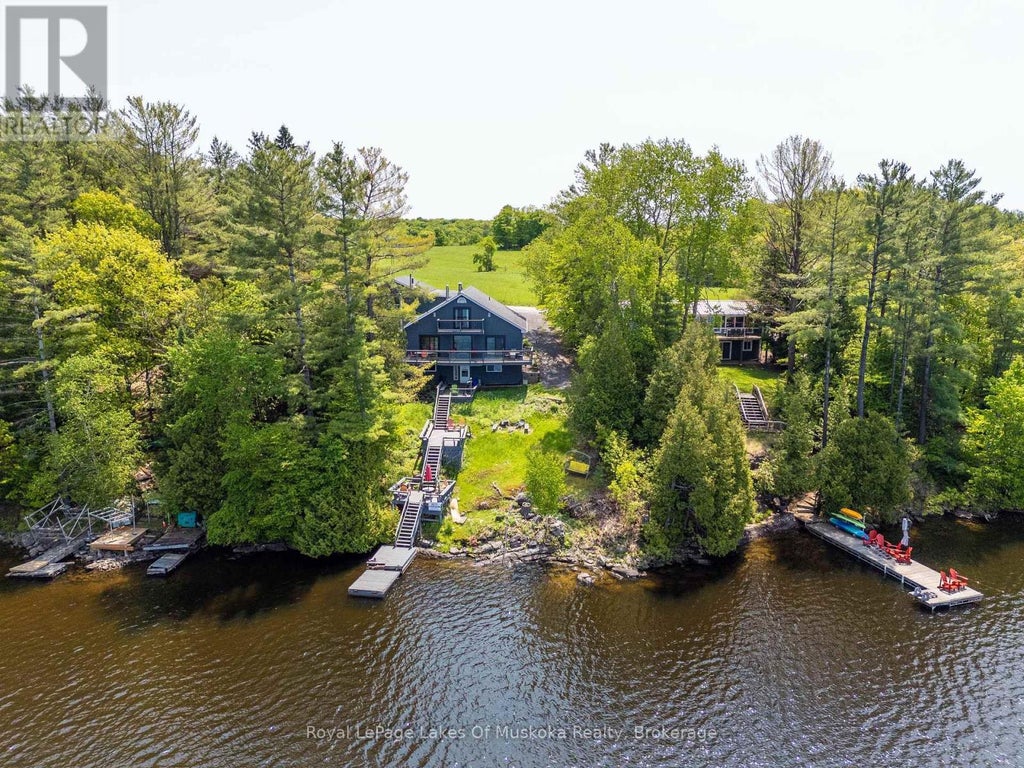 Excellent year round home or Cottage on popular Three Mile Lake! Conveniently Located only minutes from Bracebridge, Huntsville & Windermere with great year round road access. Gorgeous lot with 102' of frontage on the water offering a nice medium slope to the water's edge with shallow and deep water and easy to navigate stairs, multiple level decks and a gorgeous sunset view down Hammell's Bay! Featuring 2,900 sq ft of finished living space this one owner home/cottage has much to desire! The main floor offers; a level access foyer, bright living room with wide pine plank flooring, woodstove and large window overlooking the lake, custom kitchen w/pine cupboards and eat-in dining area w/walkout to a full width balcony, 2 main floor bedrooms including a separate primary bedroom suite featuring a den with it's own walkout to balcony & a 4pc en-suite bath + main floor laundry and 2nd full bathroom. 2nd level offers a large family room and 2 bedrooms. Full walkout basement has a self contained suite with a 2nd kitchen, living room with woodstove, 1 bedroom, separate den/office, 4pc bathroom and lots of extra storage space. Upgraded windows and doors, detached 36' x 24' garage/workshop, forced air oil furnace and central air conditioning and much more. Three Mile Lake offers a multitude of on water activities including boating, water sports, swimming, fishing and more! (id:6289)
