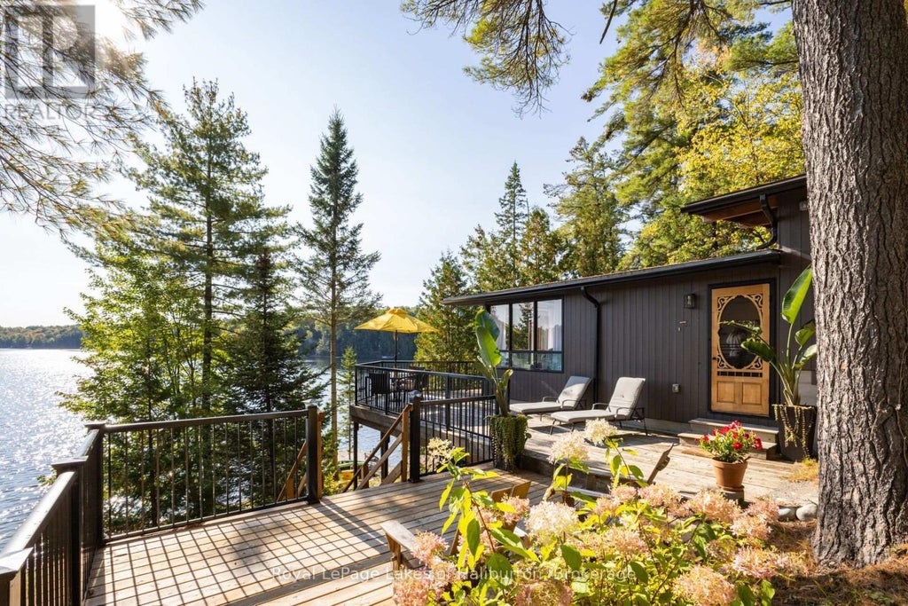 Discover the exceptional tranquility of this pristine Crystal Lake hideaway. A fabulous point lot with 2.26 acres and 300 feet of Algonquin style, rock and century pine waterfront that backs onto Crown Land. The 3-bedroom main cottage, extensively updated in 2022, pairs seamlessly with a separate, self-contained guest bunkie featuring 2 additional bedrooms, washroom, kitchenette, sitting area, laundry, and its own private deck, offering a combined living space of 1450 sq ft. This beautifully treed gem is tucked away at the very end of a privately maintained 3-season cottage road. A classic mid-century Viceroy style cottage offering a spacious open-concept interior with new high-end kitchen features including stone tops, soft close, impressive 9 ft harvest table and new appliances in 2022. A lovely screened in porch with a stunning view awaits. 14' x 16' storage shed. 200 AMP service. Outdoor shower. Updated utility systems including plumbing, water heater, water filtration with UV, and water pump in 2022. The Shore Road Allowance (SRA) is owned and has a full 2022 survey with buildings located. This ultra-private setting sets the perfect stage for enjoying one of the region's most pristine lakes - with no neighbours in sight! Crystal Lake, a spring-fed glacial treasure, is defined by its iconic rock and pine shoreline with low cottage density. Enjoy full sunrises and long lake views. 26 easy steps or a gentle pathway leads to a pair of docks for exceptional deep water swimming. Excellent fishing for bass and lake trout. 30+ kms of shoreline to explore by boat, or take a quiet paddle into Iron Mine Bay. On-water marina. Kinmount's amenities; including the Fairgrounds, Highlands Cinema, LCBO, groceries and ATV trails are 15 mins away. This 3-season property is 30-35 mins from Bobcaygeon/Fenelon Falls/Minden. Less than 2.5 hrs from the GTA. Bell 5G HS internet. This property exudes pride of ownership and is fully furnished and ready to enjoy yet this fall. (id:6289)