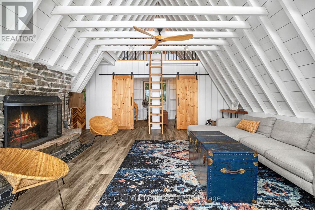 Once and while something very special comes along and you need to grab it - don't wait! "Cedar Point Aframe" on Gibson Lake is available for immediate closing and comes fully turnkey with all furniture, inside and out, along with the water toys. Move right in and enjoy Autumn at this 3 season, 760 sq ft, Aframe cabin perched right at the waters edge. Park at your brand new, private, cleared area, off the lane way and meander down to the cottage. Inside you are greeted by a screened in Muskoka room for dining off the kitchen. Into the living space, the stunning views of Gibson Lake are framed by the A and take your breath away. Both bedrooms are quietly tucked away, and a third queen bed is up the ladder to the loft. This sweet little place has been fully renovated with plenty of upgrades throughout which includes new paint, kitchen, flooring, and fixtures. This cottage is conveniently located right off HWY 400 and is 15 minutes to Port Severn, Mactier and Bala. (id:6289)