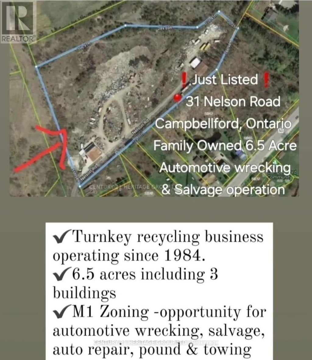 Family owned and operate 6.5 Acre home with potential for development or continue the recycling and salvage operation. This turnkey recycling business has been servicing Northumberland region since 1984. Property has 6.5 Acres with 3 buildings totaling approx 7,000 of covered sq ft, M1 Zoning (recycling uses) great opportunity for new home or automotive wrecking, salvage, auto repair, pound and towing users. Resdential home on property can be used as rental income or converted into office space. 100 ton weight scale, 5,000 lb indoor scale, Hitachi 220 excavator, 8000 lb forklift, 6000 lb forklift, 160 ton capacity scrap presser, 170 New Holland skid steer, Ford f-350 tow truck many more items included in retirement sale. **EXTRAS** Vendor will train and show trade secrets upon completion for 2 weeks. Sale of land 6.5 Acres with Multiple Structies. only recycling yard within 40-50 KM . Seller lives on property in the home. Do not approach property without appointment. (id:6289)